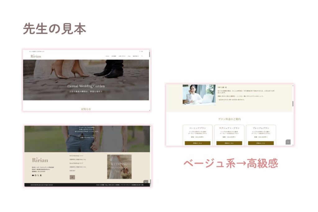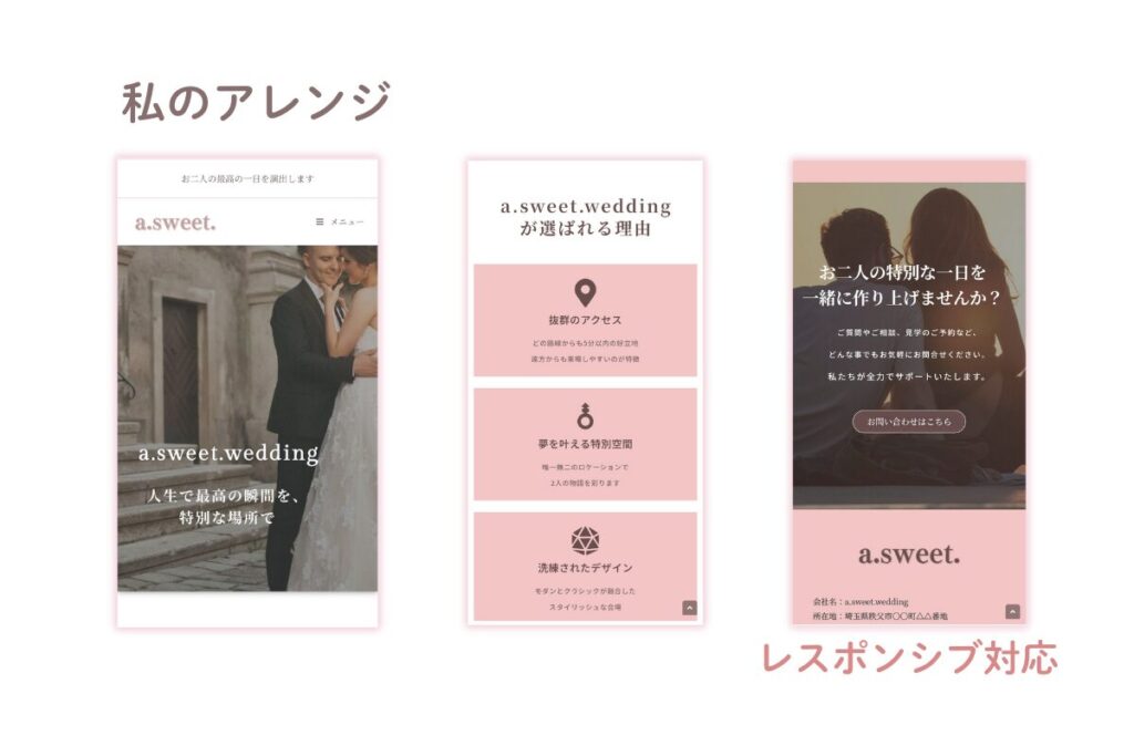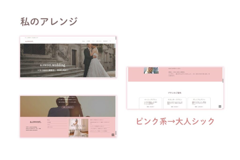 メインカラーを落ち着いたピンクに変更し、大人シックな写真を選ぶことで、より女性向けで柔らかく落ち着いた雰囲気を意識しています。