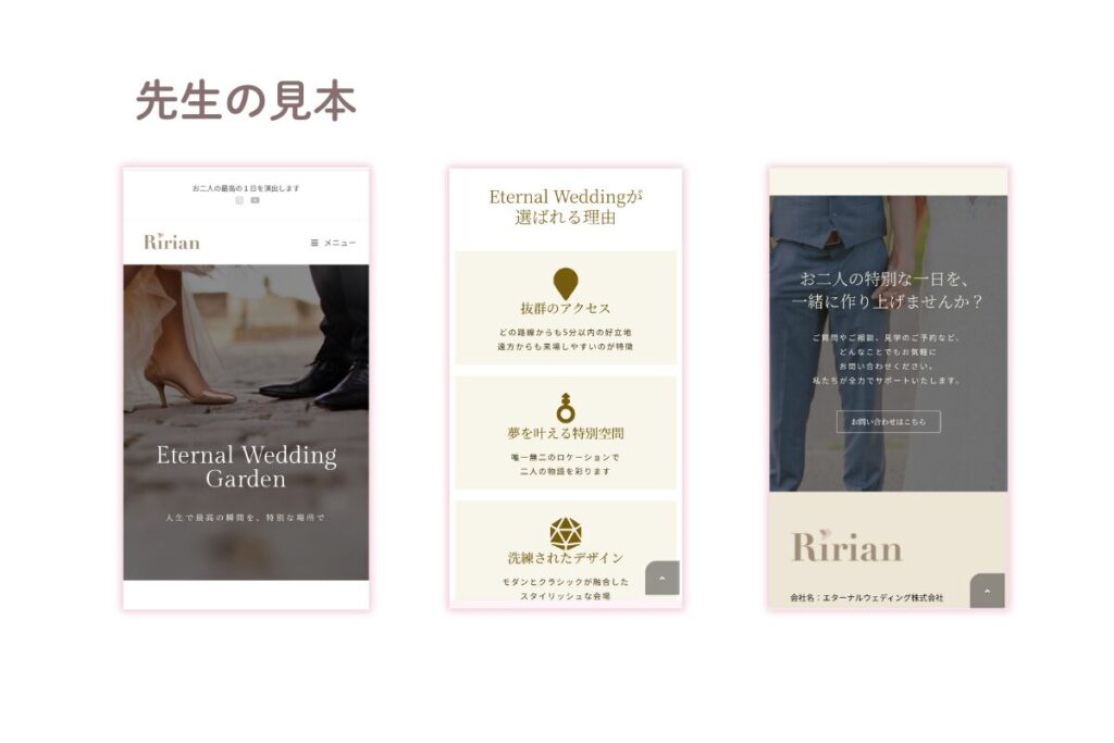 こちらは学習用のウェディングサイト模写作品です。配置は参考にしましたが、余白や行間、文字の整え方など細部まで丁寧に仕上げました。
